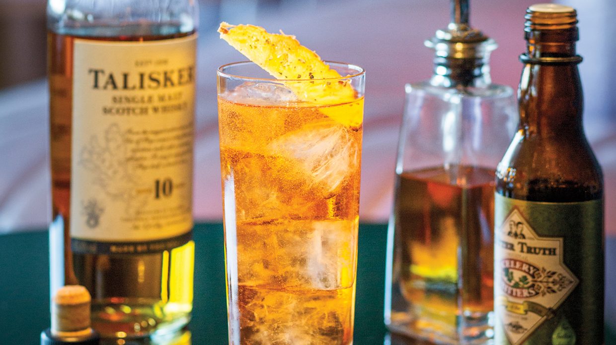 Fill a narrow highball glass with cubed ice, add all ingredients, then top with chilled club soda. Garnish with a slice of pineapple and a twist of freshly ground black pepper.