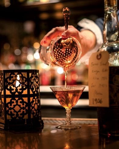 Located below the upscale and intimate restaurant The Catbird Seat, this bar is named after former Tennessee governor Malcolm Patterson, who fought Prohibition. Inside, the centerpiece is a large wraparound bar, and guests (up to eight in a single party) must be seated either at the bar or in one of the booths—no standing is permitted and seats are first come, first served. The menu features a small selection of bar-friendly food plus more than 100 whiskies, but this speakeasy is especially known for its craft cocktails, from modern concoctions like the Misfortune Cookie ($18), featuring Four Roses Yellow Label, Rivulet Pecan and Giffard Vanilla liqueurs, lemon juice, and Warsteiner pilsner, to high-end classics like the Glen- Dronach 12 Rob Roy ($34), comprising GlenDronach 12 year old, Cocchi di Torino vermouth, and Angostura bitters. thepattersonnashville.com